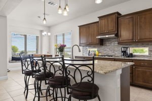 The heart of the home is a light-filled living area with soaring windows that bring the outdoors in, creating a warm and inviting atmosphere. A floor-to-ceiling stone fireplace anchors the room with warmth and character, infusing the space with rustic elegance and cozy charm—perfect for quiet nights or lively get-togethers. The open layout flows into a beautifully appointed kitchen, complete with a large island, granite countertops, stainless steel appliances, and abundant cabinetry. A charming breakfast nook with a window seat offers a casual space for morning coffee, reading, or catching up with loved ones.