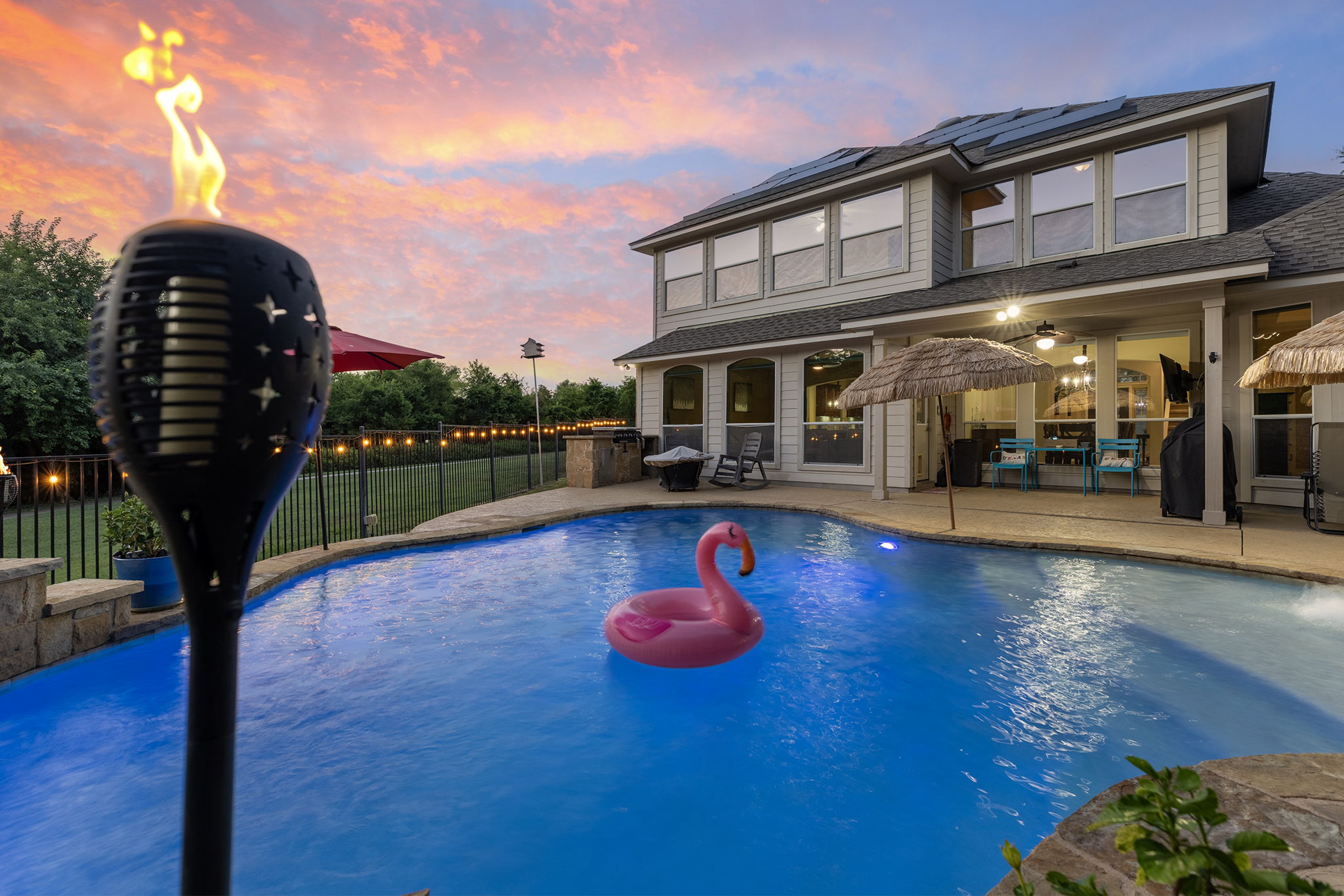 Discover the ultimate suburban oasis in this exquisite 4-bedroom, 2.5-bathroom home nestled in Round Rock's Paloma Lake community. Situated on nearly 1/3 acre, on a cozy cul-de-sac with wooded greenbelt views and no neighbors along the back, you'll feel a world away as you blissfully float in your private pool, listening to the gentle sounds from the waterfalls. Pulling up to the home, the massive drive offers plenty of parking for entertaining, and the three-car garage provides room for everyone. Upon entering the home with a soaring foyer, your guests will be captivated by the spacious layout and modern design elements that define this residence. The heart of the home is the chef-inspired kitchen, boasting granite countertops, stainless steel appliances, and convenient double ovens, perfect for culinary enthusiasts and everyday meals alike. The nearby living room and formal dining room feature walls of windows overlooking the backyard and heavily wooded greenbelt for that feeling of complete privacy. The primary suite is a true retreat with floor-to-ceiling windows to enjoy the views, a spa bath with jetted tub, and a walk-in closet that must be seen to be believed. Entertainment options abound with a generously sized game room upstairs, ideal for large gatherings or leisurely evenings. Adjacent is a private media room with built-in speakers and TV that seamlessly integrate for a cinematic experience right at home. Three large secondary bedrooms, a bathroom with dual vanity, & wall of storage cabinets round out the upstairs space. Enjoy the convenience of a sprawling laundry room with ample space for storage and organization. Energy efficiency and sustainability are at the forefront, with a Tesla Powerwall providing backup electricity capable of sustaining the home for two days alongside solar panels that reduce utility costs. Step outside into your private oasis featuring a meticulously maintained gunite, in-ground pool. Designed with both aesthetics and functionality in mind, the pool includes a sophisticated battery backup system to prevent freezing, ensuring year-round enjoyment. The pool features varying depths of 5 feet in the middle and 4.5 feet at the sides, surrounded by tasteful manmade stonework that enhances the outdoor living experience. Additional amenities include a recently replaced 2-year-old roof for added peace of mind and an outdoor grill perfect for entertaining guests during sunny Texas afternoons. Just outside the door, you can access the community trail system leading to lakeside amenities: fishing pond, pickleball court, two parks/playgrounds, splash pad, bi-level pool, community center, and nearly five miles of trails around the lake & creek, additional parks, playgrounds, and second amenity complex. Less than a 10-minute drive to Toll Road 130 with further easy access to Toll Road 45 and I-35, and less than 15 minutes from shopping and dining in the University Oaks and Hutto areas, you'll never be at a loss for things to do!
